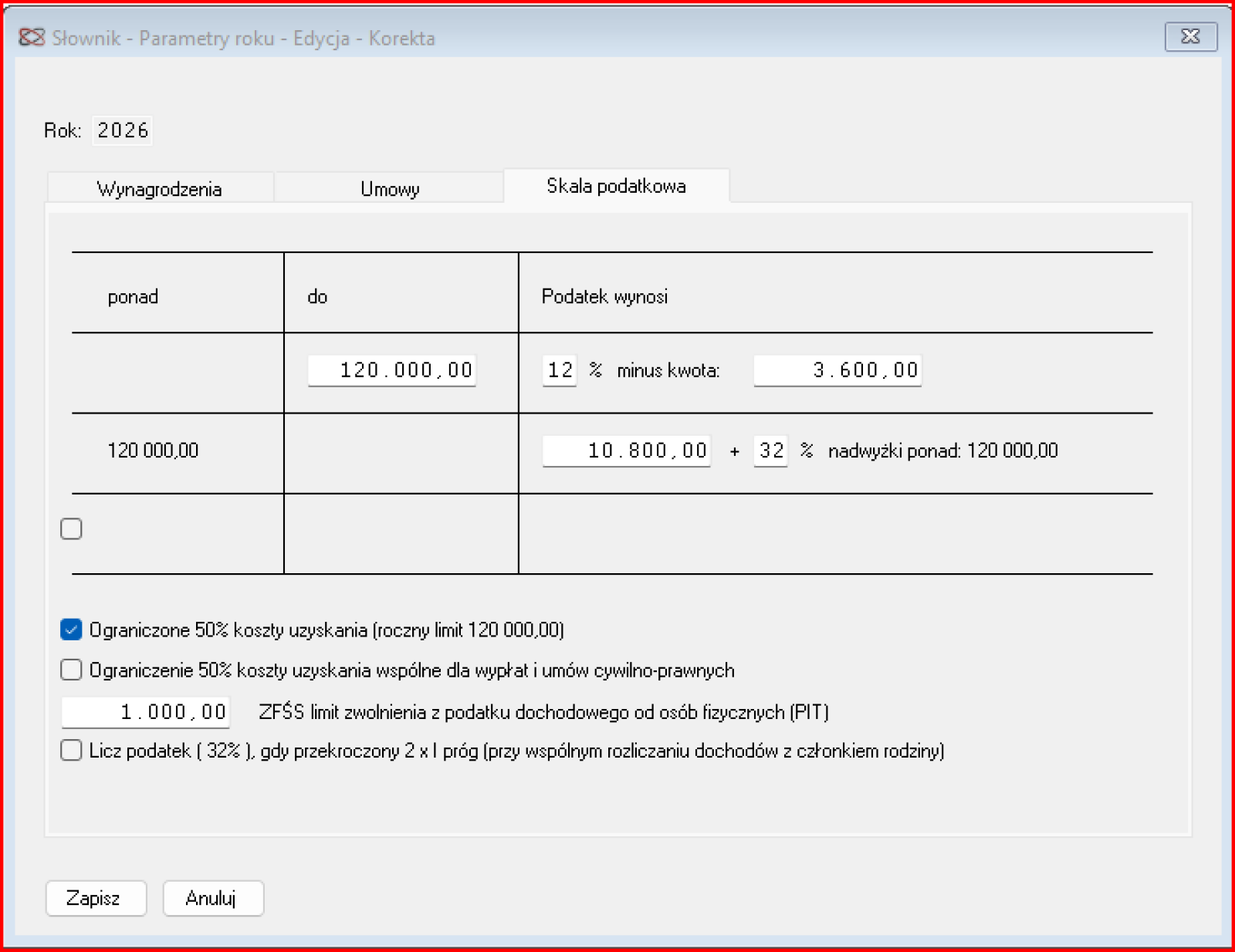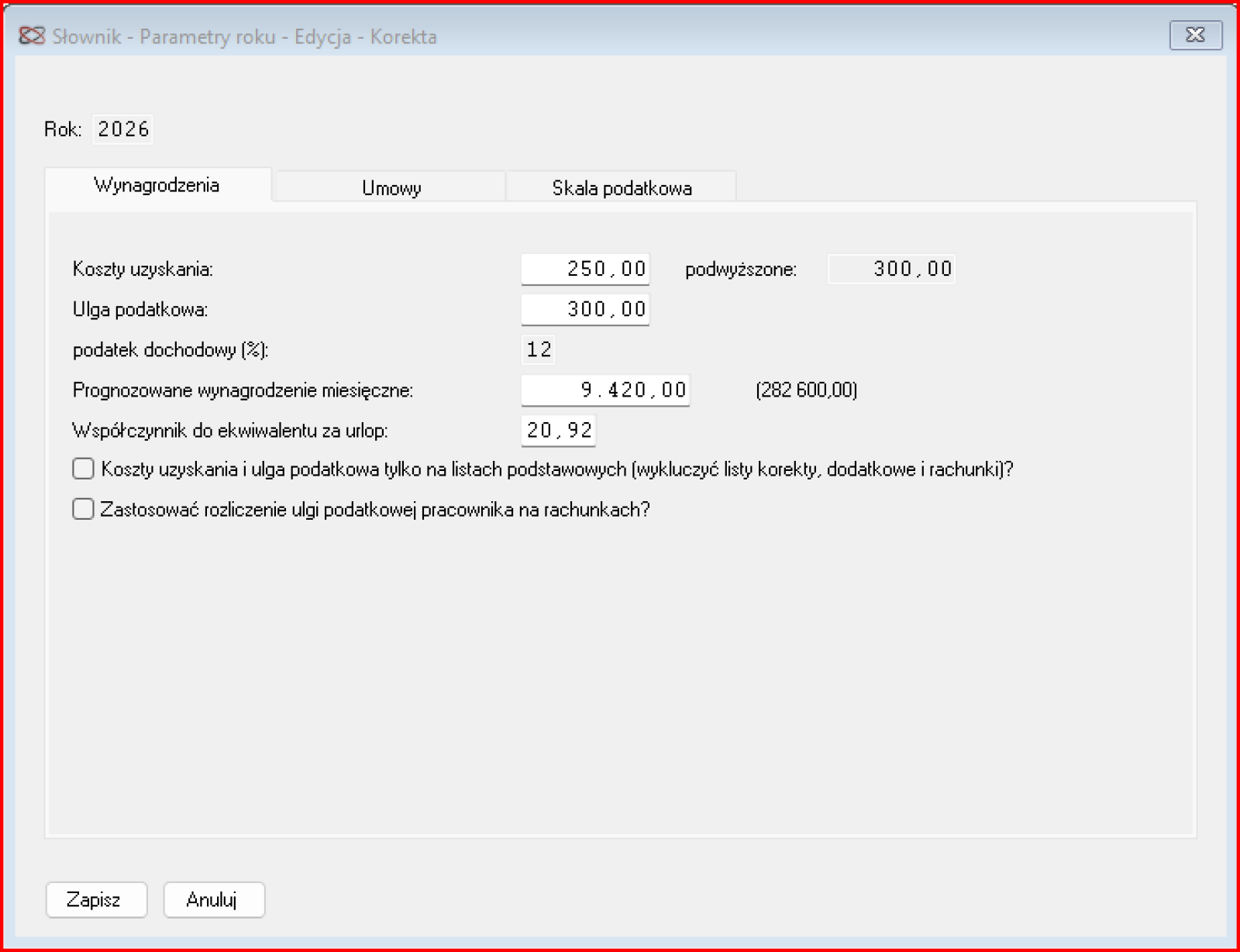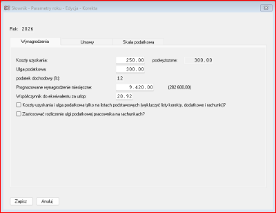 Założyć lub zaktualizować dane na 2026 r. w słowniku parametry roku wybierając Serwis -> Słownik -> Parametry roku. Poniżej prawidłowo wypełnione wskaźniki:Dodając rok 2026 system podpowiada: